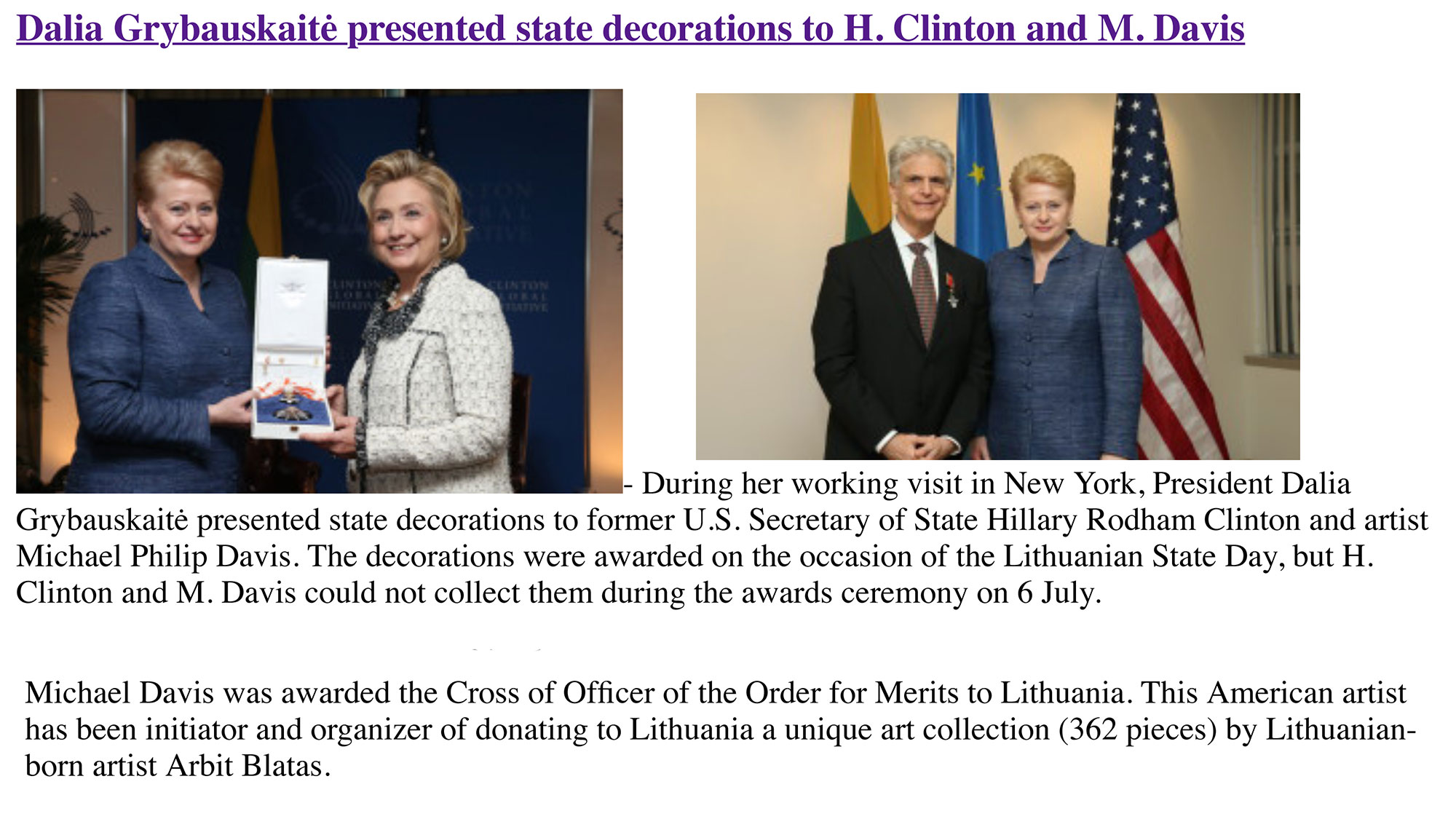 In 2013 Lithuanian President Dalia Grybauskaitė presented Michael Philip Davis with the Cross of Officer of the Order for Merits to Lithuania in a ceremony in New York, honoring Michael’s artistic and cultural contributions to that nation. Click here for article.